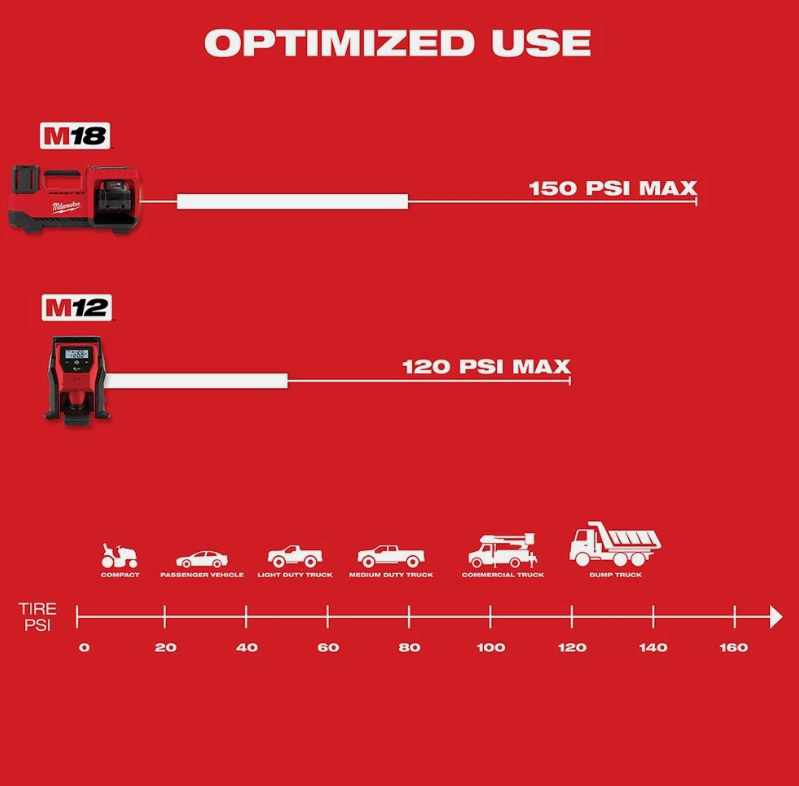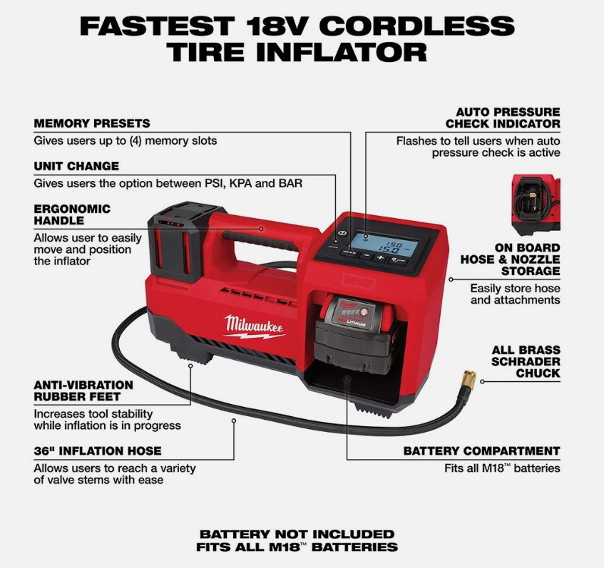 Funciona con cualquier batería Milwaukee M18 (no incluida). Perfecto para profesionales en movimiento o usuarios que buscan una solución confiable para inflado portátil.