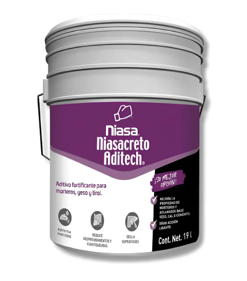 Fortificante Niasacreto Aditech 19 L, ideal para aplanados y texturizados, incrementa adherencia, resistencia y vida útil en superficies.