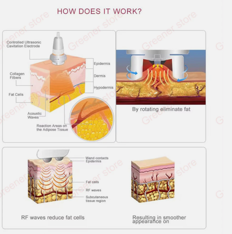 • Cavitación 40K: rompe las células grasas con ondas ultrasónicas.